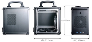 Model: PC-TU100 Case Type: Mini Tower Chassis Dimensions: (W) 170mm (H) 277mm (including feet and handle) (D) 252mm Color: Black Front bezel Material: Aluminum Side Panel: Aluminum Body Material: Aluminum Net Weight: 1.77 kg 5.25" drive bay (External):